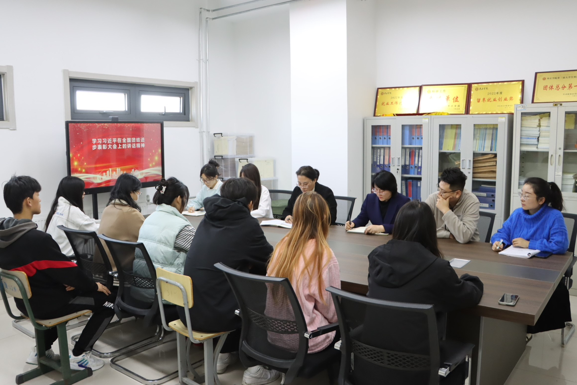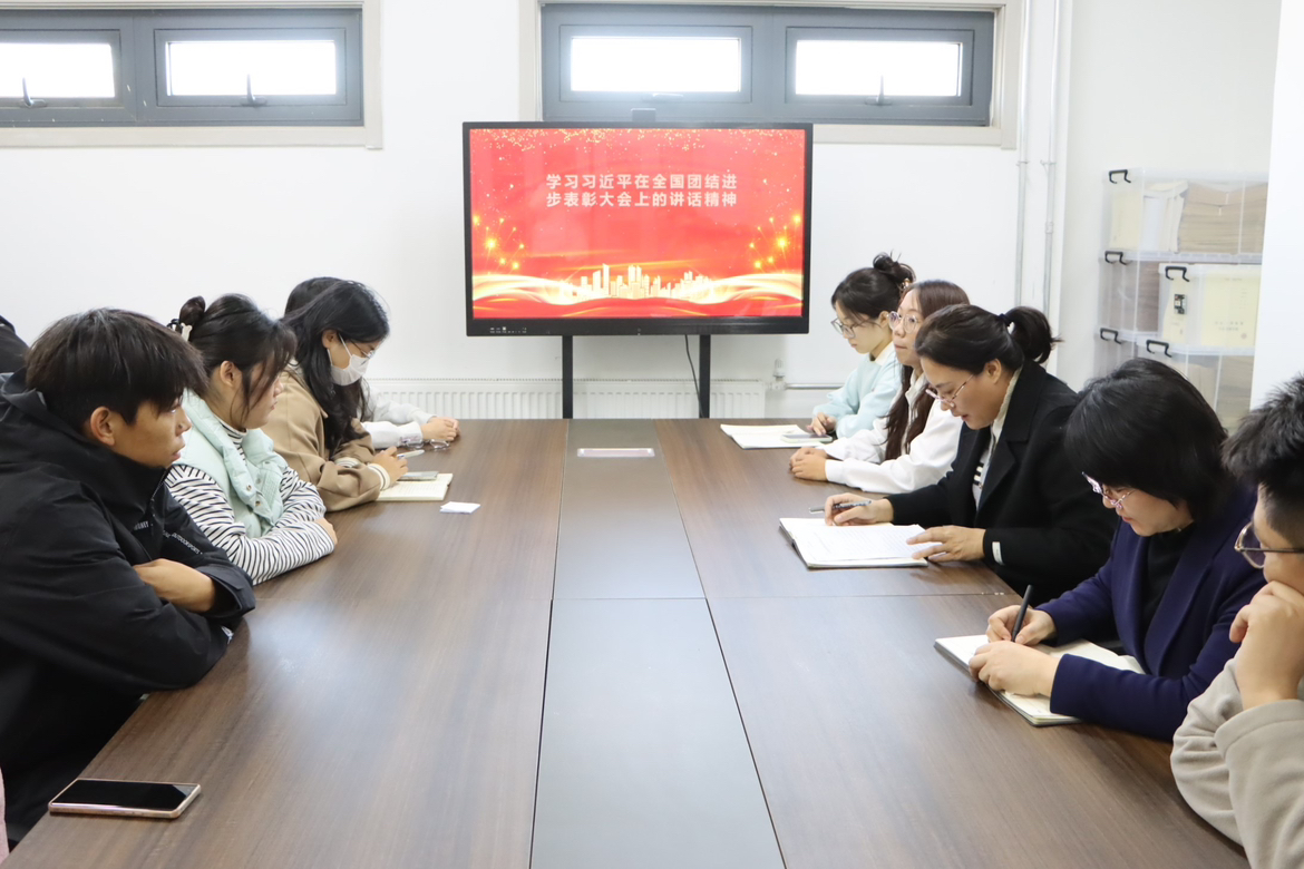 11月25日下午, 6776永利集团积极响应国家号召,组织十余名少数民族学生,深入学习习近平总书记在全国民族团结进步表彰大会上的重要讲话精神,党委副书记华莹出席,统战委员王元元及辅导员代表参加。