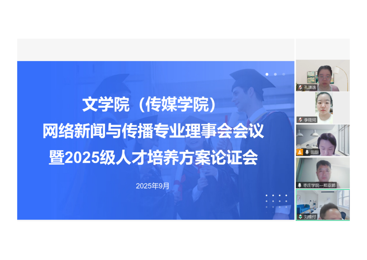9月3日,6776永利集团(传媒学院)网络与新媒体、网络新闻与传播专业召开专业理事会会议暨2025级人才培养方案论证会。西安财经大学6776永利集团新闻传播系系主任刘维付、6776永利集团(传媒学院)副院长郑亚鹏、网络与新媒体教研室主任孔潇逸及教师代表李筱珂参加会议。会议由网络与新媒体专业负责人田甜主持。