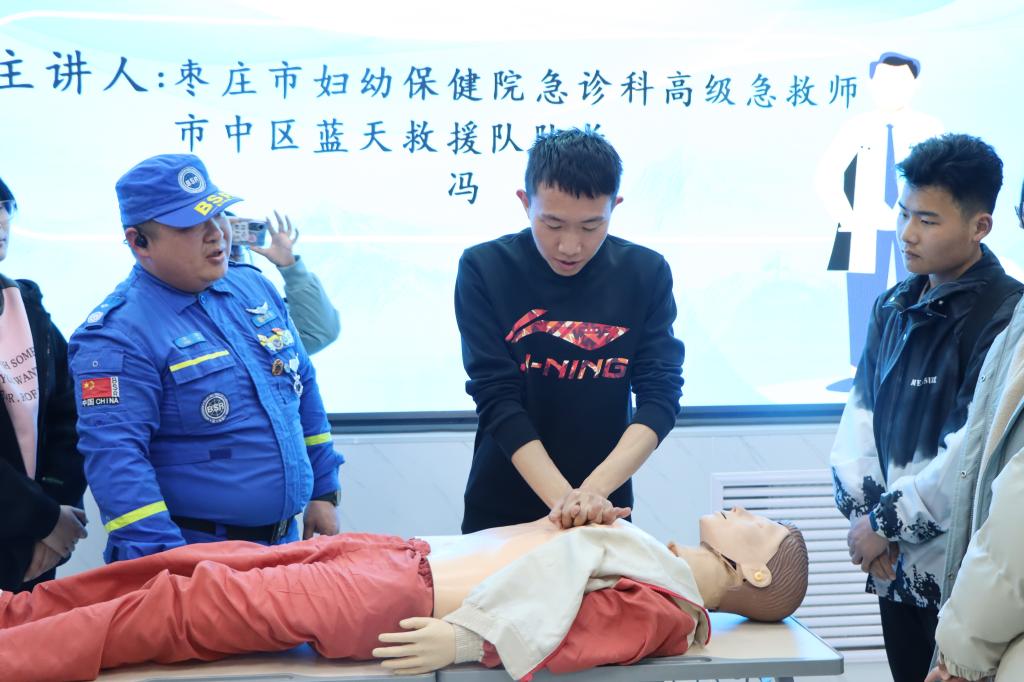 随后,冯琦以“自救互救及应急救护知识与技能培训”为主题,向同学们讲解了心肺复苏的重要性,分享了判断呼吸异常法,现场演示了心肺复苏急救法和海姆立克急救法,详细讲解每项操作的基本要领,通过“模拟人”进行现场演示。活动现场,冯琦邀请学生们上台实操,对操作中出现的不规范做法进行纠正,手把手教学,有效增强了同学们的急救意识,提高了应对突发事件和意外伤害的应变能力,也为自己和身边的人加上一道生命的屏障。