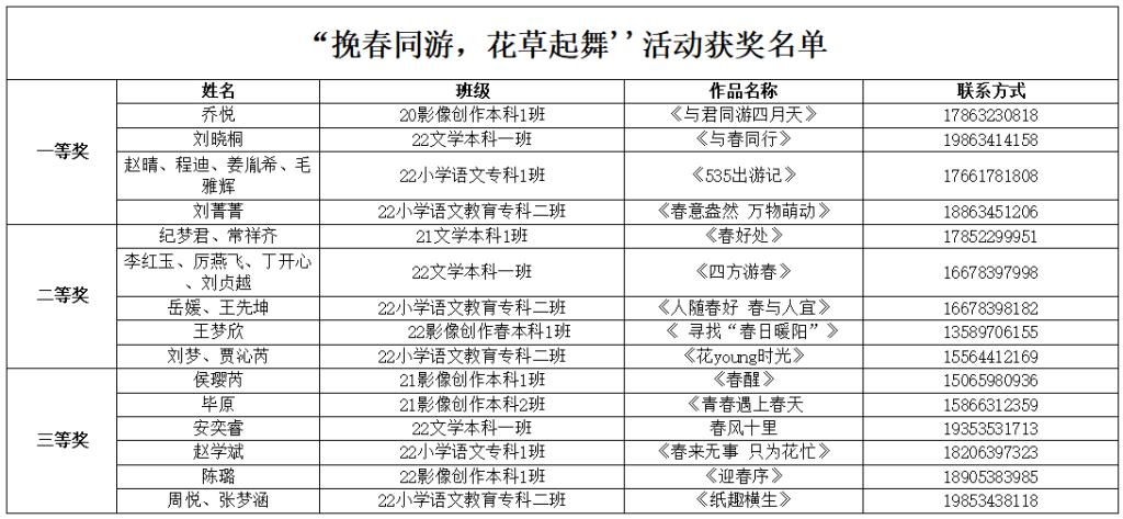 其中,“和春天碰个面吧”主题春游活动,同学们通过照片或视频Vlog的形式充分展示生命的生机活力与大自然的生机盎然,借春游之行释放青春活力,在与朋友携手同游中拍照打卡,享受春光明媚,放松心情。在“春日特调”花草纸活动中,同学们以春日为主题自制花草纸,用相框、手账、灯笼等形式进行呈现。此次活动,同学们踊跃参与,共上交了98份优秀活动作品。经过评审,乔悦等25位同学获得奖项,获奖名单如下。