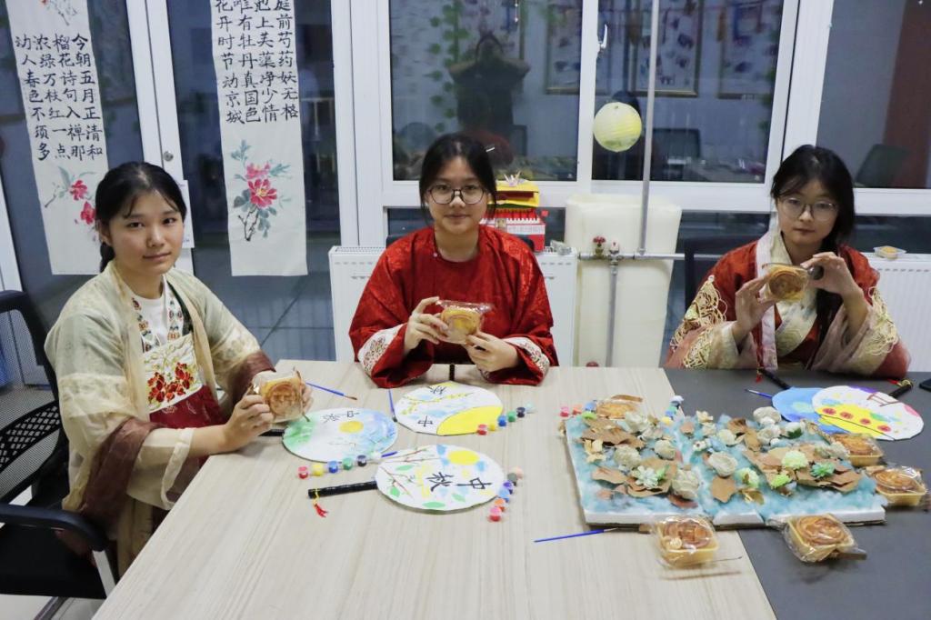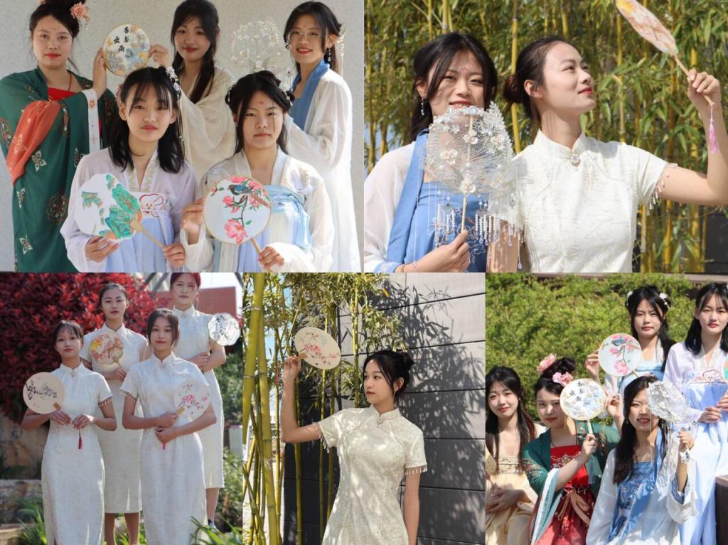 “裁为合欢扇,团团似明月”,团扇是中国传统工艺品,象征着团圆美满,同学们以中秋为主题,将浓浓的中秋感受和心中美景描绘在团扇上。经过精心的绘制,一幅幅生动的花好月圆跃然于扇面之上,同学们分享着美味的月饼,身着传统服饰,手持自绘团扇在校园内展示传统文化魅力,体验节日文化氛围。