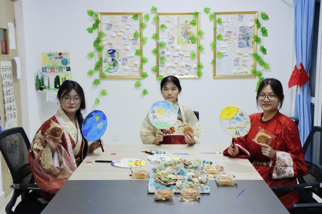本次活动内容丰富多彩,有中秋诗词朗诵、节日故事分享、团扇制作、古装校园打卡等环节。“明月几时有,把酒问青天……”一首诗朗诵《水调歌头》拉开了本次祝活动的序幕。同学们以诗词“诵”月,畅聊古今中秋诗词以及诗歌、诗人背后的故事,共话“嫦娥奔月”“玉兔捣药”“祭月”“燃灯”等中秋有关的神话传说,在欢快的节日氛围中,增强了大家对中秋节风俗和内涵的解读。