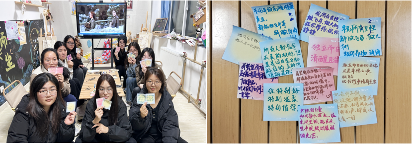 本次活动以“光影映芳华,致最美的你”为主题,以集体观影《小妇人》,撰写留言卡的形式展开。影片《小妇人》通过马奇家四姐妹迥异的人生选择,展现19世纪女性突破时代桎梏、寻求人生价值的动人篇章。在观影过程中,影片的内容展现的女性的魅力,引发了在场女性内心的共鸣。观影结束后,便是温馨的留言卡纪言环节。大家纷纷拿起笔,在留言卡上写下观影后的感悟、对自己的激励话语,以及对其他女生的美好祝福。这些饱含深情的文字,在女生们之间传递着温暖与力量。