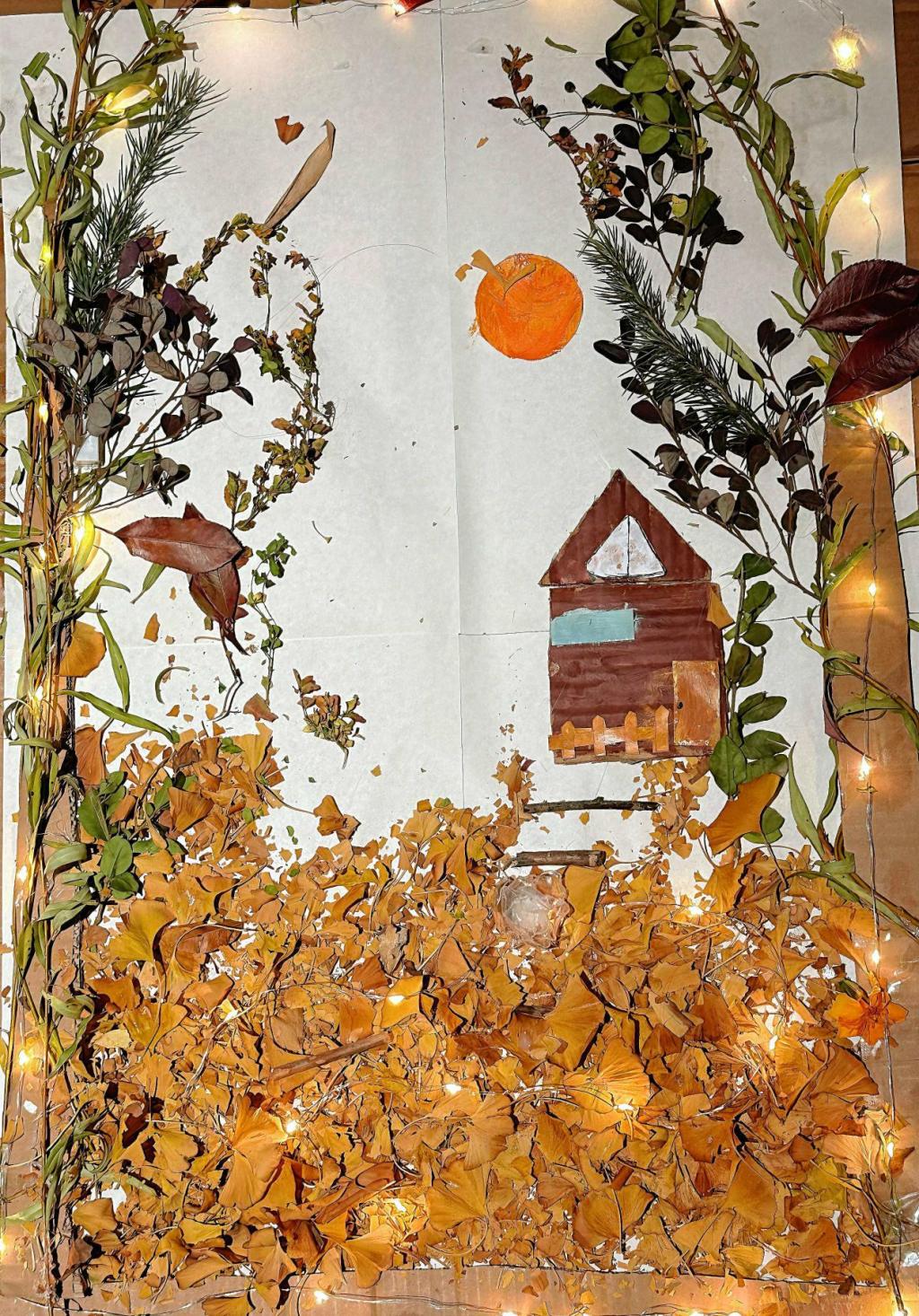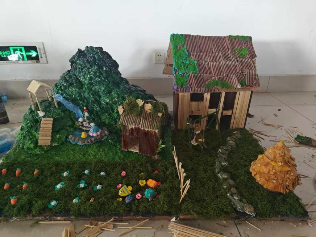 活动分为初赛与决赛,设置工艺品、创意海报、树叶贴画三类评比项目。同学们积极参与,巧用塑料瓶、落叶、废纸箱等废弃材料备战,赋予废品“第二次生命”。过程中,大家既深化了环保认知,也提升了动手能力。最终活动评选出一等奖1名、二等奖2名、三等奖3名、优秀奖4名。其中,我院作品《溪畔木舍·草木栖居》以食堂打包餐具木棍、快递盒瓦楞纸为原料,搭配可降解颜料,生动诠释“变废为宝”的巧思;树叶贴画《秋野星屋》用银杏叶、枝条拼贴秋日乡村图景,定格自然美好,呼应“万物皆有价值”的理念。