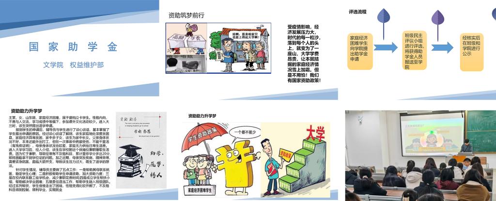 本次活动中主题教育班会以爱国感恩、自立、自强和诚实守信为主要板块开展教育,引导受助学生群体正确使用国家资助,养成勤奋学习、勤俭节约的习惯,树立不盲目攀比,不过度消费的正确价值观。同时,各班生活委员向班级同学们讲述资助政策的组成部分与申请流程,其中着重对于国家助学金板块展开深入讲解,对于评选流程、条件、资助对象与标准进行详细说明。此外,我院还通过绘制资助育人板报,加大对国家资助政策的宣传力度。