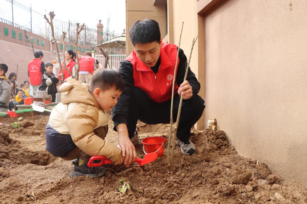 春日暖阳,风与光都温柔地洒在校园。在植树现场,身穿红马甲的志愿者“大朋友”们与活泼可爱的小朋友们,一起培土、浇水,共同栽下一棵棵爱心树。在同学们的帮助下,孩子们把一片片写有“爱心树”“友谊林”“绿宝贝”心愿卡系在树枝上。崭新的树苗轻轻摇曳,沾着泥点的小脸上绽放着童真。在教室里,同学们通过精心准备的PPT,向小朋友们讲解植树节的由来,讲述树木森林创造宜居生态环境的重要意义,分享人与自然和谐生共处的故事。小朋友们认真聆听,踊跃发言,欢声笑语不断。