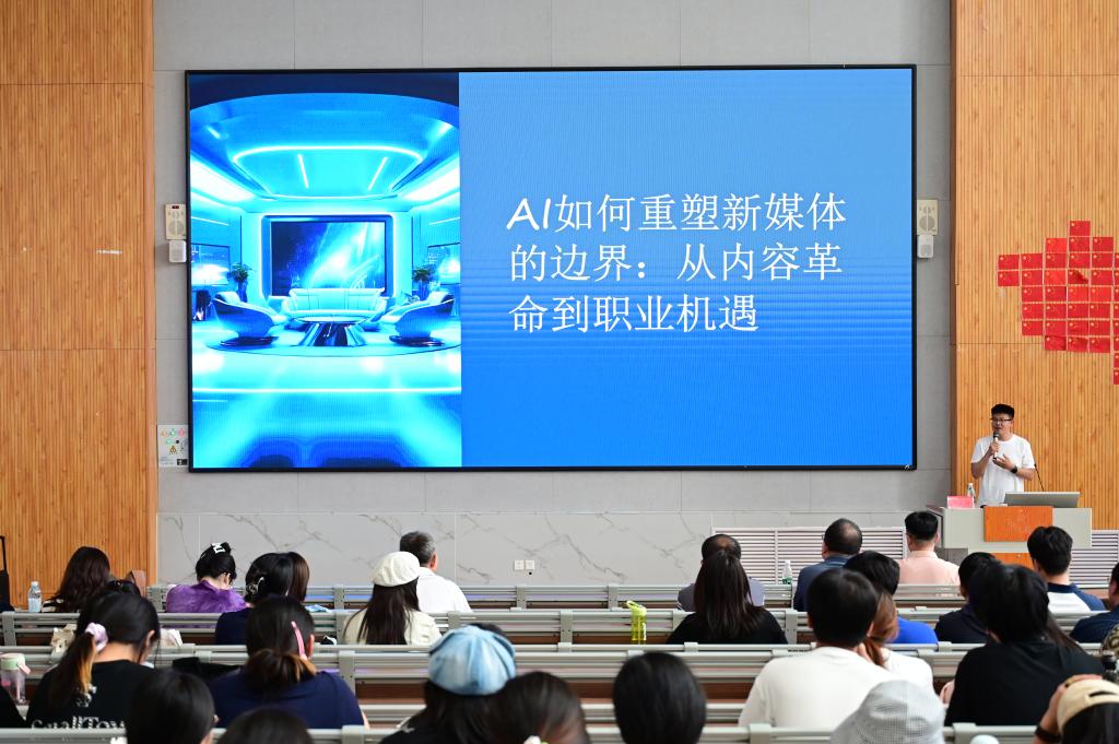 刘学为做了“AI如何重塑新媒体边界 :从内容革命到职业机遇”的报告。他详细梳理了AIGC的发展历程,结合AIGC在新媒体领域的实战案例,生动展示了AI技术在项目中的应用以及在工作中的影响,指出其能够提升创作速度和效率,拓展创意边界,并增强内容的个性化和互动性。此外,他还对AIGC影视工作流各环节所需的人才和工具进行了解析,为学生提供了清晰的职业发展路径。