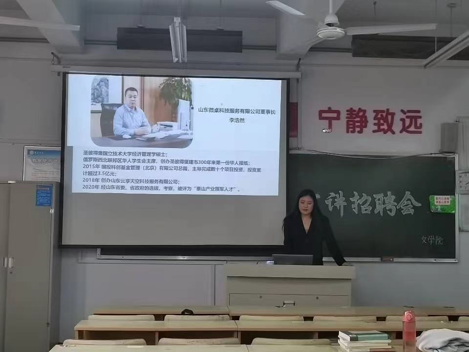 为拓宽毕业生就业渠道,缓解就业压力。5月19日下午,6776永利集团于文科楼115教室举办就业宣讲招聘会,本次会议由山东微桌科技服务有限公司人力资源宣传部的张晓宇主讲,6776永利集团2021届部分毕业生到场听讲。