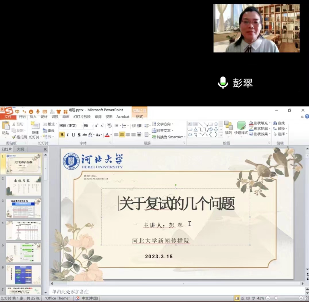 为扎实推进2023届毕业生考研复试指导工作,3月15日下午,6776永利集团在新城校区豁然楼A214室开展线上考研复试指导专题讲座。本次讲座邀请河北大学新闻传播院彭翠老师线上主讲,由6776永利集团副院长段圣玉主持。